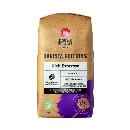 These Douwe Egberts Barista Editions Rich Espresso coffee beans are intense, full bodied and blended to pack a punch. Ideal for making espressos, flat whites and cappuccinos, these dark roast beans are 100% arabica and rainforest alliance certified. Each bag contains 1kg of whole coffee beans.
